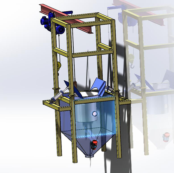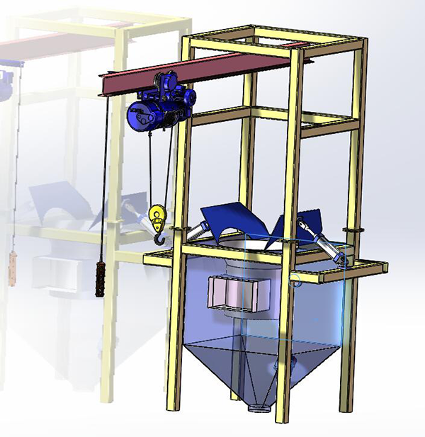 下(xià)料倉:上部(bù)配有圓形變徑可使物料袋下料口更好(hǎo)的對準料倉中心並加快物料下落速度。中間部分(fèn)配(pèi)有手動解繩的工作(zuò)門。下部與目標倉法蘭連接(jiē)(也可增加(jiā)橡膠軟(ruǎn)連接與目標法蘭對接)。對比A型拆包機B型拆包機在此部位加大(dà)了料倉的容積並預(yù)留了除塵引風口。